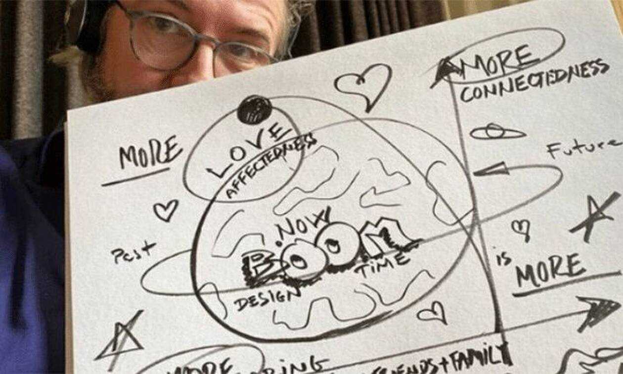 Στο σκίτσο, καρδιές και άστρα ως σύμβολα θετικής διάθεσης και ελπίδας, αλλά και οι λέξεις «παρελθόν» και «μέλλον» γύρω από τη γήινη σφαίρα.