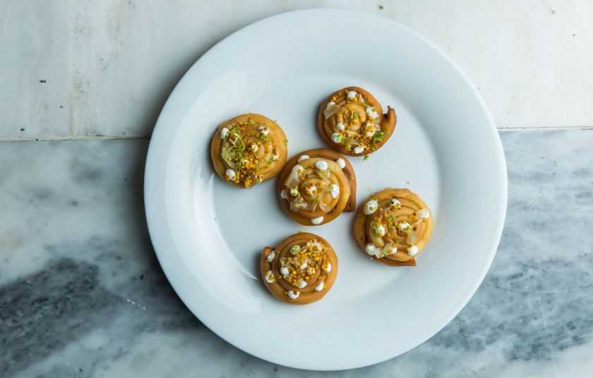 Πίτα: Σε ελαφρώς αλευρωμένη επιφάνεια πλάθουμε τη ζύμη σε κορδόνι και την ανοίγουμε με τον πλάστη σε μακρόστενο λεπτό φύλλο με διαστάσεις περίπου 35 x 5 εκ. Το λαδώνουμε και αδειάζουμε τη γέμιση κατά μήκος της άκρης της μακριάς πλευράς του φύλλου. Έπειτα τυλίγουμε το φύλλο σε μακρύ ρολό-φλογέρα, καλύπτοντας τη γέμιση. Βρέχουμε με ελάχιστο νερό τις άκρες για να κολλήσουν, το στρίβουμε σε σαλίγκαρο και το βάζουμε στο ψυγείο για περίπου 1 ώρα, μέχρι να σφίξει. Βάζουμε να ζεσταθεί άφθονο λάδι σε ένα φαρδύ και βαθύ σκεύος, μέχρι να φτάσει τους 160°C (δηλαδή σε φωτιά μέτρια προς δυνατή). Βυθίζουμε προσεκτικά την πίτα στο λάδι και την τηγανίζουμε για λίγα λεπτά, μέχρι να ροδίσει απαλά. Τη στραγγίζουμε σε χαρτί κουζίνας, τη διακοσμούμε με μικρές κουταλιές από γιαούρτι και σκορπίζουμε πάνω της το γλυκό με άνθη λεμονιάς, τη γύρη και το ξύσμα.