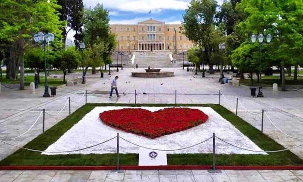 Η καρδιά αποτελείται από 1500 κόκκινες πετουνιες και τα λουλούδια σε μιά εβδομάδα θα μεταφυτευθούν στο Πάρκο Ευαγγελισμού, δίπλα στο νοσοκομείο που γιατροί και νοσηλευτές δίνουν μάχη απέναντι στην πανδημία.