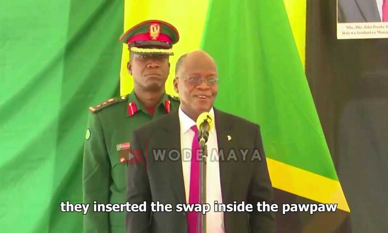 «Το λάδι του αυτοκινήτου, για παράδειγμα, με την ετικέτα Τζαμπίρ Χαμζά, 30 ετών, βρέθηκε αρνητικό. Αλλά το δείγμα από παπάγια, το οποίο ονομάσαμε Ελίζαμπεθ Ανν, ηλικίας 26 ετών, ήταν θετικό», αποκάλυψε ο Τανζανός Πρόεδρος.