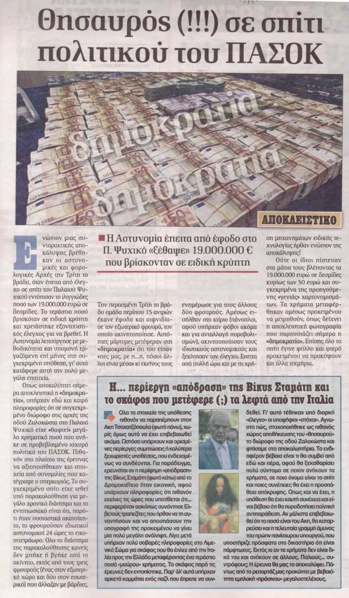 Σύμφωνα με δημοσιεύματα που βασίζονται σε «αποκλειστικό άρθρο και φωτογραφία» της εφημερίδας «Δημοκρατία», η Ελληνική Αστυνομία εντόπισε σε κρύπτη οικίας στο Παλαιό Ψυχικό, το ποσό των 19 εκατομμυρίων ευρώ που φέρεται να ανήκει σε πρώην πολιτικό του ΠΑΣΟΚ.