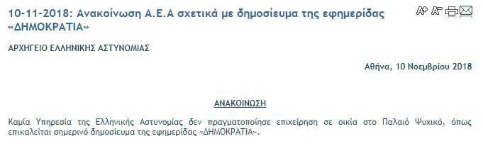 Λίγη ώρα αργότερα το Γρ. Τύπου εξέδωσε ανακοίνωση λέγοντας ότι: «Καμία Υπηρεσία της Ελληνικής Αστυνομίας δεν πραγματοποίησε επιχείρηση σε οικία στο Παλαιό Ψυχικό, όπως επικαλείται σημερινό δημοσίευμα της εφημερίδας ΔΗΜΟΚΡΑΤΙΑ.»
