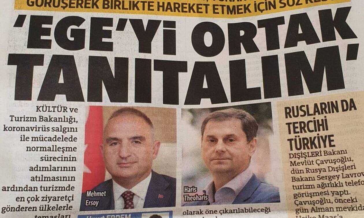 Η Hurriyet με πρωτοσέλιδο τίτλο «το αστέρι του καλοκαιριού είναι το Αιγαίο» αναφέρει πως ο Χάρης Θεοχάρης και ο Τούρκος ομόλογος του Μεχμέτ Έρσοϊ συνομίλησαν τηλεφωνικά και τονίζει πως «συμφώνησαν να κάνουν μια κοινή εκστρατεία προβολής για το Αιγαίο που θεωρείται ασφαλής περιοχή στην περίοδο της πανδημίας».