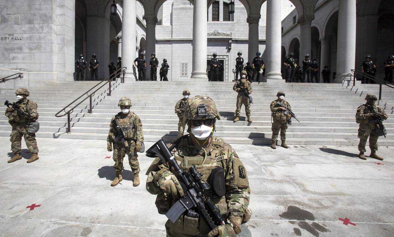 Στο Λος Άντζελες, στρατιώτες της Εθνοφρουράς με πολεμική εξάρτυση και οπλισμένοι με τουφέκια άρχισαν να περιπολούν στο κέντρο της πόλης το πρωί.