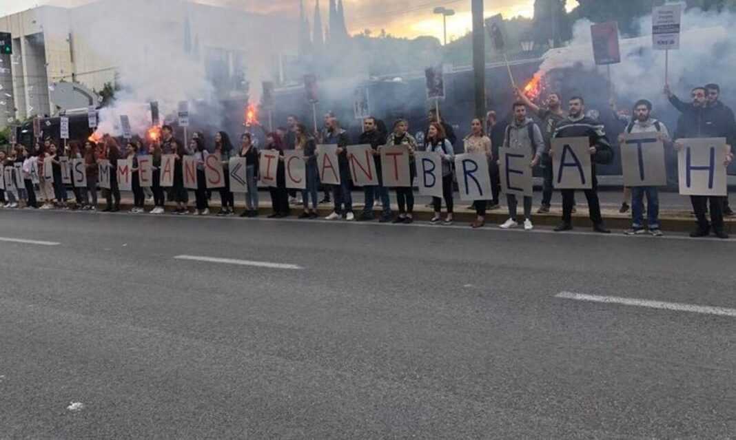 Το σύνθημα αυτό σχημάτισαν μέλη της ΚΝΕ έξω από την Αμερικάνικη Πρεσβεία, στο πλαίσιο της παράστασης διαμαρτυρίας που πραγματοποίησε η ΚΝΕ για τη δολοφονία του Τζορτζ Φλόιντ από αστυνομικό.