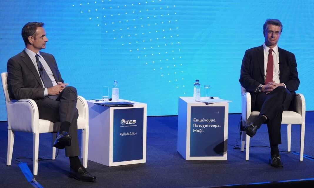 Αμέσως μετά την ομιλία του Πρωθυπουργού Κυριάκου Μητσοτάκη στην Ετήσια Γενική Συνέλευση του Συνδέσμου Επιχειρήσεων και Βιομηχανιών, ακολούθησε συζήτηση με τον Πρόεδρο του ΣΕΒ, Δημήτρη Παπαλεξόπουλο