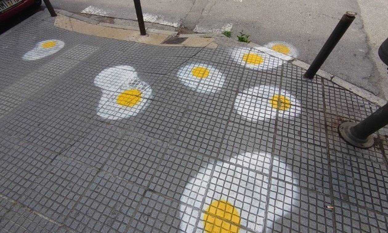 Περπατώντας στο κέντρο της Θεσσαλονίκης, με το βλέμμα σηκωμένο ψηλά, αντικρίζει κανείς εικόνες από γκράφιτι σε τοίχους κτιρίων με λογής λογής σχέδια και μηνύματα. Υπάρχουν, όμως, και κάποιοι που περπατούν συνεχώς με το κεφάλι σκυμμένο πάνω από μια οθόνη κινητού… Σ’ αυτούς «απευθύνονται» τα …τηγανητά αβγά «μάτια» που υπάρχουν σε διάφορα πεζοδρόμια στο κέντρο, στη Βασ. Όλγας αλλά και σε άλλα τυχαία σημεία της πόλης. Μια αναπάντεχη συστάδα από γκράφιτι με κεντρικό «ήρωα» το τηγανητό αβγό που αιφνιδιάζει ευχάριστα!