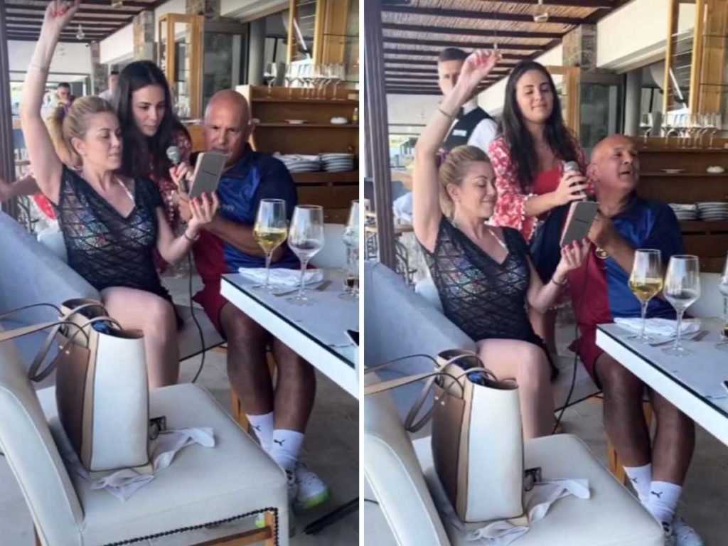 Η κ. Μανωλίδου ήρθε στο κέφι και τραγούδησε καραόκε τη «γκαρσόνα» σε ντουέτο με την κόρη της Θεοδώρα Ολυμπία, χωρίς να λογαριάζει τα βλέμματα που ήταν στραμμένα πάνω της.
