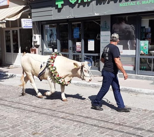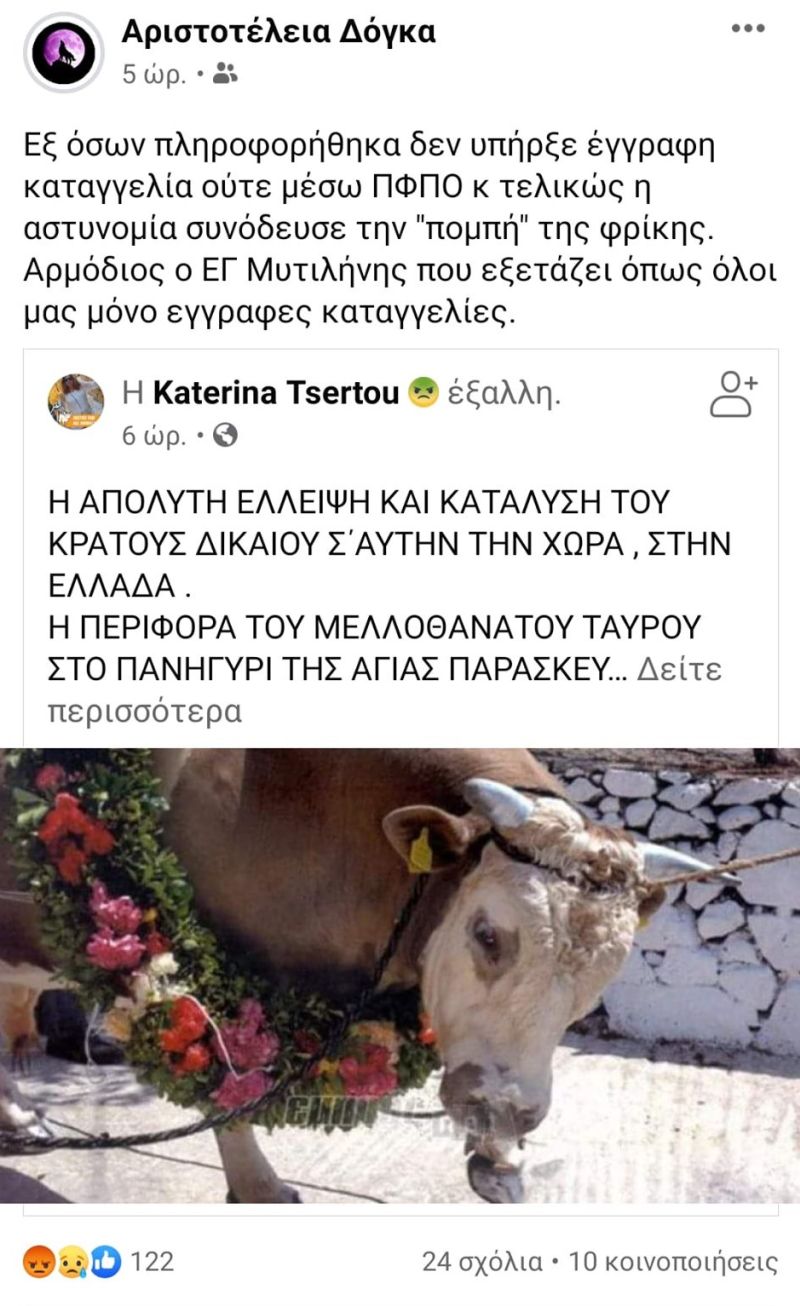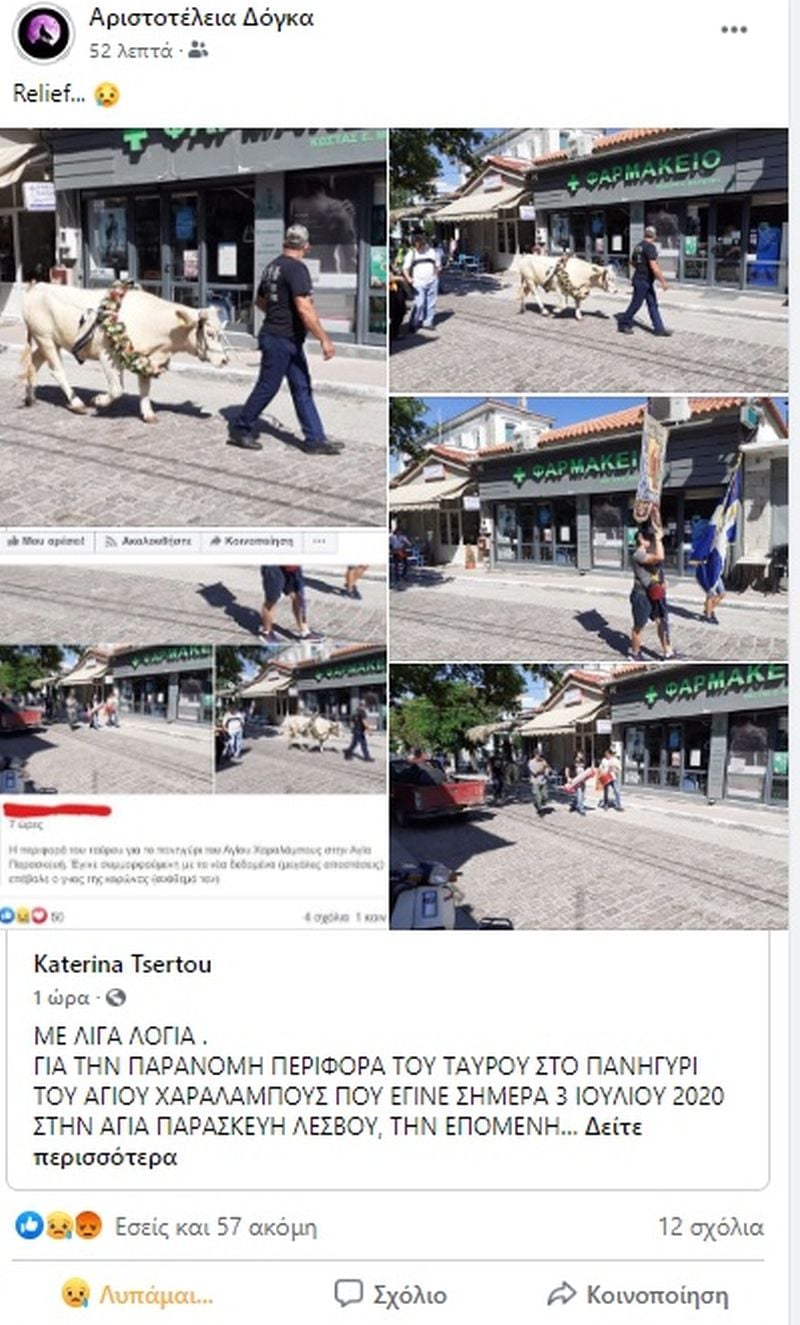 «Τελικά πραγματοποιήθηκε στην Αγία Παρασκευή , το σκοταδιστικό έθιμο της περιφοράς και σφαγής του ταύρου , σήμερα 3/7/2020 στην Λέσβο.
