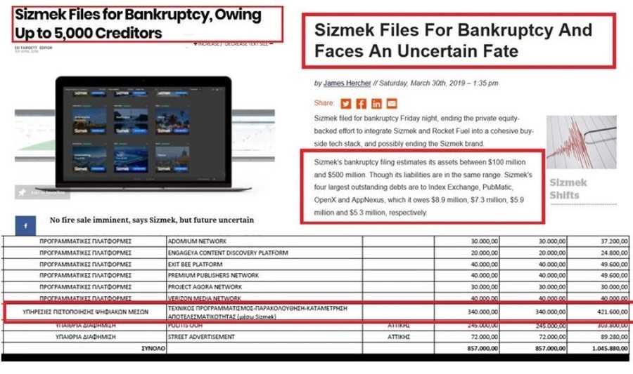 «Η Sizmek, η μεγαλύτερη ανεξάρτητη πλατφόρμα διαφήμισης της αγοράς, υπέβαλε πτώχευση, αφού ο κύριος υποστηρικτής των ιδιωτικών μετοχών έκοψε την πρόσβαση στο κεφάλαιο εν μέσω μιας απώλειας χιονοστιβάδας. Η κατάθεση πτώχευσης δείχνει ότι οφείλει χρήματα σε 1.000 ως και 5.000 πιστωτές, συμπεριλαμβανομένων $4,5 εκατομμυρίων στην Google. Τα χρέη της Sizmek εκτιμώνται από $100-500εκ