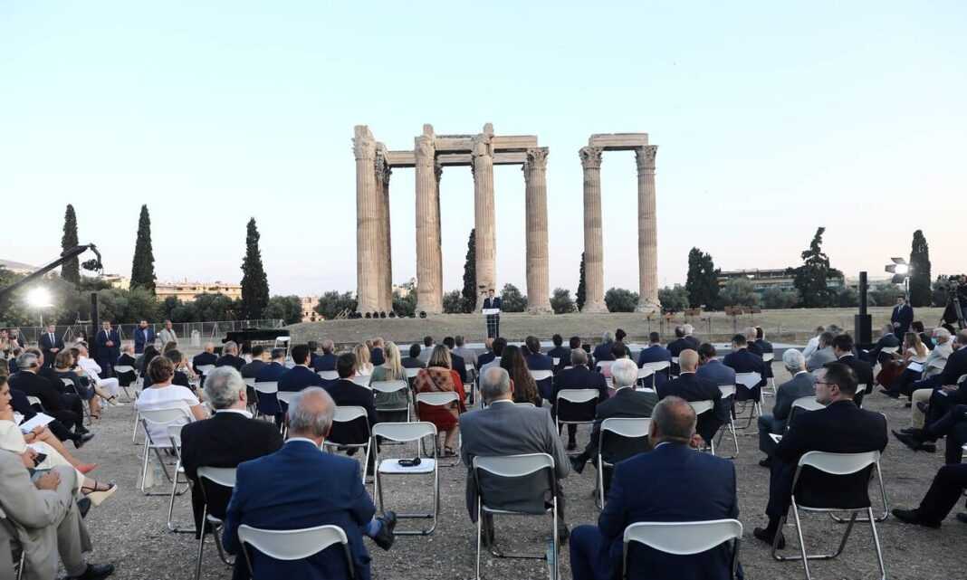 Με φόντο τους στύλους του Ολυμπίου Διός ξεκίνησε στις 20:15 η κεντρική εκδήλωση της ελληνικής Προεδρίας του Συμβουλίου της Ευρώπης, παρουσία της Προέδρου της Δημοκρατίας, Κατερίνας Σακελλαροπούλου και του πρωθυπουργού, Κυριάκου Μητσοτάκη.