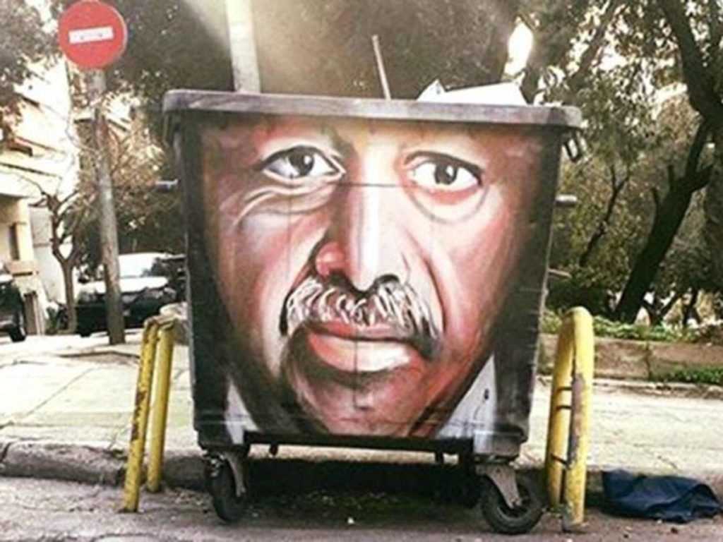 Συγκεκριμένα, ο grafity artist «Hambas», άφησε το στίγμα του ζωγραφίζοντας τον Ταγίπ Ερντογάν, στην μπροστινή μεριά ενός κάδου απορριμάτων, στην οδό Υμηττού, στο Παγκράτι.