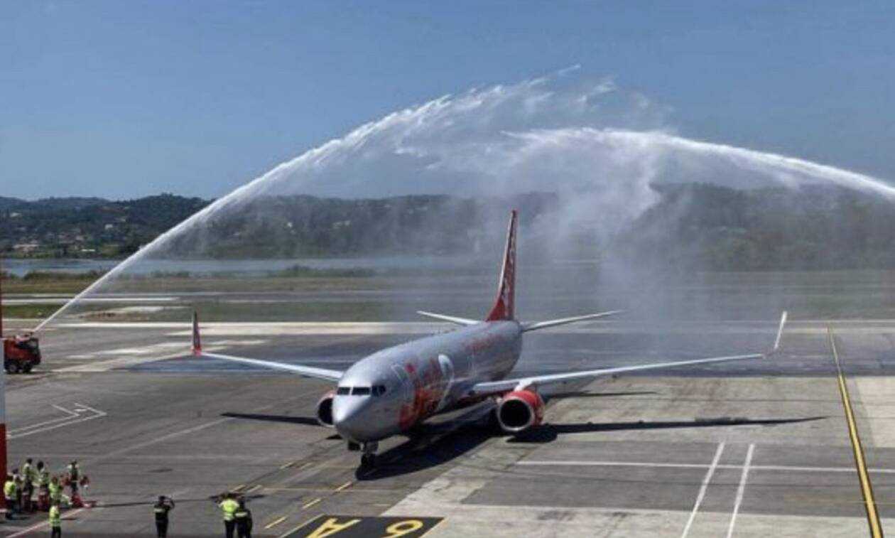 Με αψίδες νερού υποδέχθηκαν την πρώτη και μοναδική – για σήμερα – πτήση της σαιζόν από το Birmingham στο αεροδρόμιο Ι. Καποδίστριας με περίπου 90 επιβάτες και με την εταιρεία Jet 2.