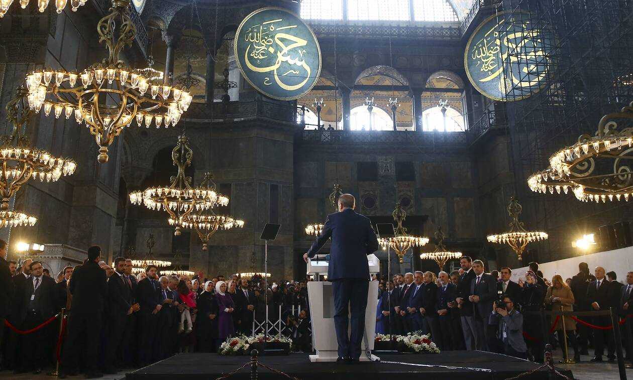 Την ίδια στιγμή, στην Κωνσταντινούπολη οι προετοιμασίες για τη μετατροπή της Αγίας Σοφιάς σε τζαμί συνεχίζονται σε πυρετώδεις ρυθμούς. «Γι’ αυτούς που αγνοούν την οικειοποίηση των πέντε αιώνων και επιμένουν να αντιμετωπίζουν την Αγία Σοφία με βάση το καθεστώς που υπήρχε πριν από την άλωση, θα πρέπει να σκεφτόμαστε άλλα πράγματα, στην περίπτωση που δεν πρόκειται για μια απλή απερισκεψία. Εξάλλου, δεν έχουμε ξεχάσει στις διαδηλώσεις στους δρόμους, τα συνθήματα που γράφονταν στους τοίχους, σύμφωνα με τα οποία η καταπίεση ξεκίνησε το 1453. Σίγουρα, γνωρίζουμε και εμείς και όλο το έθνος πολύ καλά το ποιοι έχουν γράψει αυτά τα συνθήματα», δήλωσε ο πρόεδρος της Τουρκίας Ρετζέπ Ταγίπ Ερντογάν.