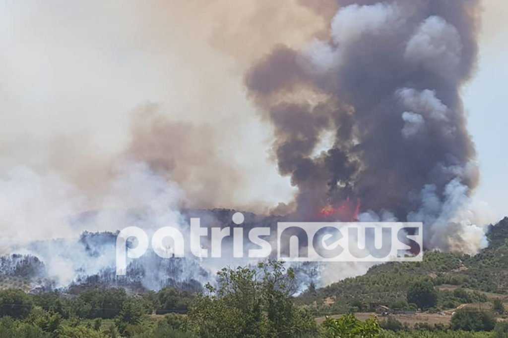 Σύμφωνα με την ρεπορτάζ του patrisnews.gr η φώτια είναι ανεξέλεγκτη και πλησιάζει το χωριό Χελιδόνι. Οι καμπάνες της εκκλησίας του χωριού χτυπούν και υπάρχουν πληροφορίες για εκκένωση χωριών.