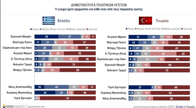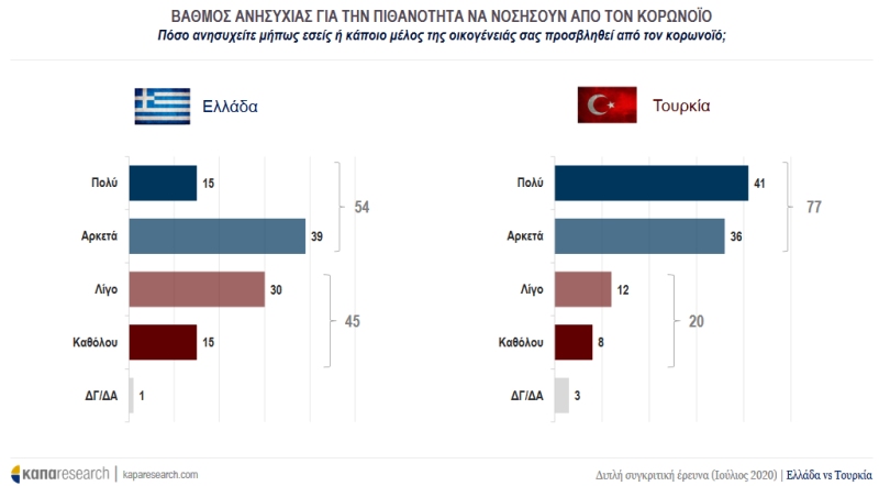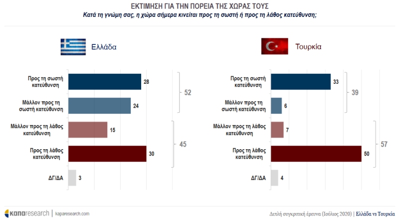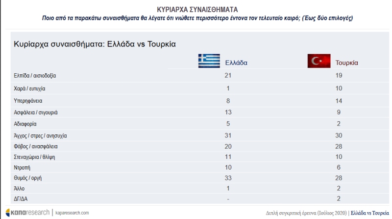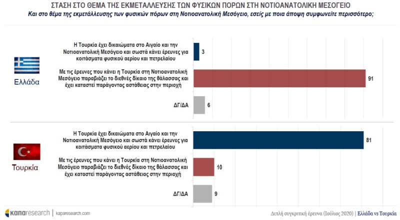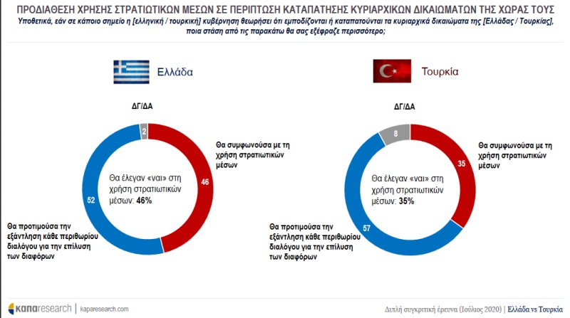 Αντίθετα, οι Έλληνες της έρευνας θεωρούν προσβλητική και επιθετική την τουρκική πολιτική (Αγία Σοφία -γεωτρήσεις σε Αιγαίο/Κύπρο, παρουσία πολεμικού στόλου) και γενικά θεωρούν την Τουρκία ως απειλή, και παρουσιάζονται πιο έτοιμοι για τυχόν χρήση στρατιωτικών μέσων.