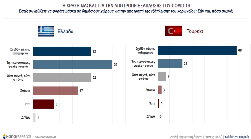 Έρευνα επικαιρότητας σε Ελλάδα και Τουρκία πραγματοποίησε η ΚΑΠΑ RESEARCH για θέματα σχετικά με την ελληνοτουρκική ένταση και την Ανατολική Μεσόγειο, την Αγία Σοφία, αλλά και τον κορωνοϊό. Ιδιαίτερο ενδιαφέρον παρουσιάζει το πώς αντιλαμβάνονται τα πράγματα πολίτες των δύο χωρών.