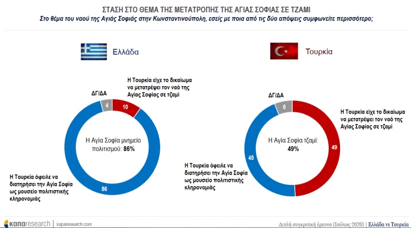 Αυτό που αναδεικνύεται από την έρευνα είναι πως η μετατροπή της Αγίας Σοφίας σε τζαμί δεν συσπειρώνει την κοινωνική πλειοψηφία στην Τουρκία, ενώ όσον αφορά τα ελληνοτουρκικά, τα δύο τρίτα της τουρκικής κοινής γνώμης προτιμούν τον διάλογο για την επίλυση των διαφορών στην περιοχή και δεν προκρίνουν τη χρήση στρατιωτικών μέσων.