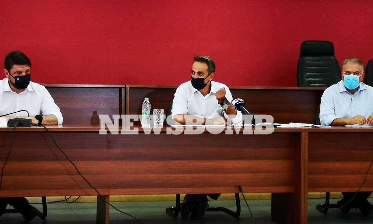Ο Κυριάκος Μητσοτάκης πραγματοποίησε αρχικά εναέρια αυτοψία των πληγεισών περιοχών με ελικόπτερο της Πυροσβεστικής, συνοδευόμενος από τον Υπουργό Εσωτερικών Τάκη Θεοδωρικάκο, τον Υφυπουργό Προστασίας του Πολίτη Νίκο Χαρδαλιά, τον Γενικό Γραμματέα Πολιτικής Προστασίας Βασίλη Παπαγεωργίου και τον Γενικό Γραμματέα Υποδομών, Γιώργο Καραγιάννη.