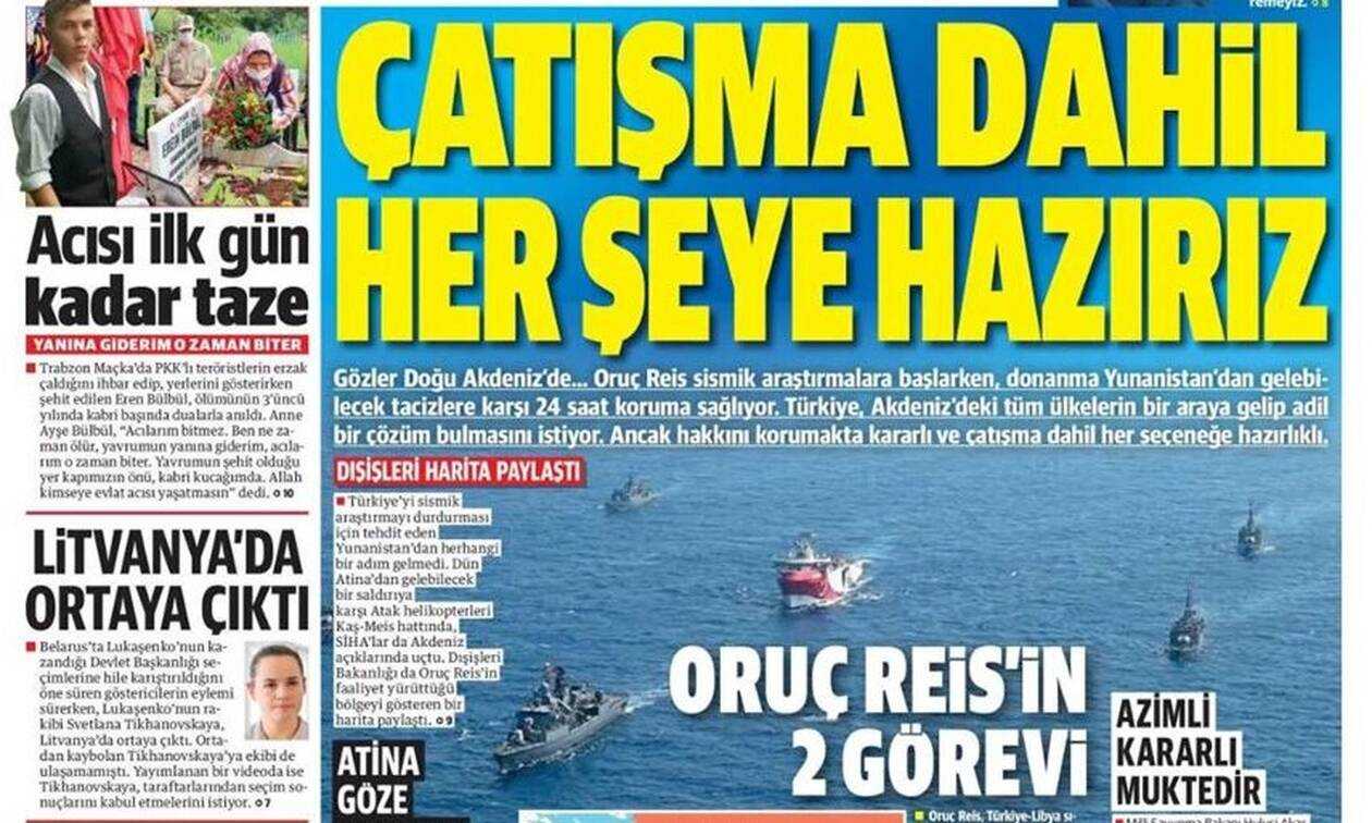 Την ίδια ώρα, ο τουρκικός Τύπος συνεχίζει να πανηγυρίζει για τις κινήσεις του προέδρου Ερντογάν και την παρουσία του Oruc Reis στην Ανατολική Μεσόγειο, επιτιθέμενος παράλληλα στην Ελλάδα.