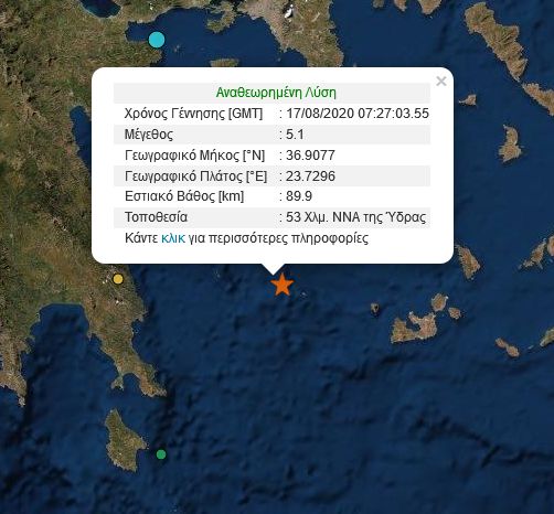 Σύμφωνα με το Γεωδυναμικό Ινστιτούτο, η σεισμική δόνηση που σημειώθηκε στις 10:27 ήταν μεγέθους 5,1 βαθμών της κλίμακας Ρίχτερ και το επίκεντρο εντοπίζεται 53 χλμ. νοτιο-νοτιοανατολικά της Ύδρας.