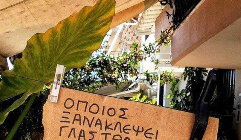 Αγανακτισμένοι με εκείνους που είχαν βάλει στο «μάτι» τις γλάστρες τους αποφάσισαν να κρεμάσουν μια χάρτινη ταμπέλα η οποία γράφει: «όποιος ξανακλέψει γλάστρα να του κοπούν τα χέρια».