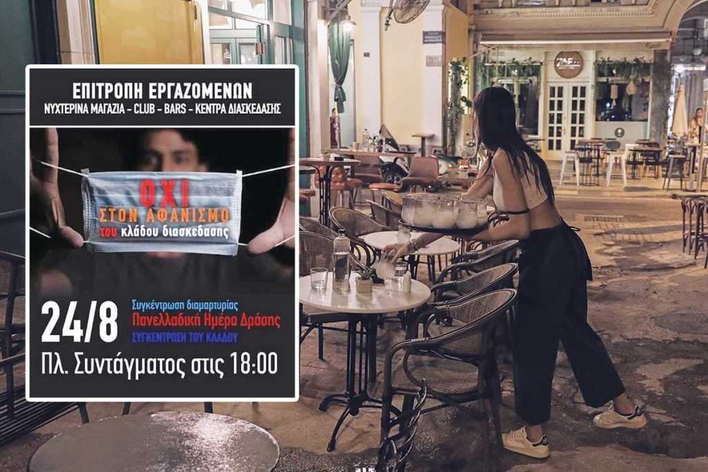 Μάλιστα είναι τέτοια η απόγνωσή τους, που εργαζόμενοι σε νυχτερινά μαγαζιά, κλαμπ, μπαρ και κέντρα διασκέδασης διοργανώνουν στο Σύνταγμα τη Δευτέρα 24 Αυγούστου, στις έξι το απόγευμα, πανελλαδική συγκέντρωση με κεντρικό σύνθημα «Όχι στον αφανισμό του κλάδου διασκέδασης», θέλοντας να εκπέμψουν SOS στην κυβέρνηση.