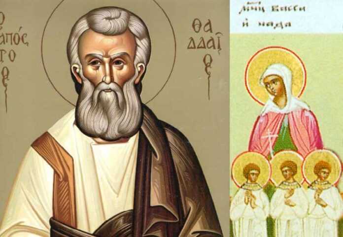 Εβραίος από την Έδεσσα ο Θαδδαίος και πολύ μορφωμένος στις θείες Γραφές, είχε ανέβει στην Ιερουσαλήμ για προσκύνημα την εποχή του Ιωάννου του Βαπτιστού. Όταν άκουσε το κήρυγμά του και είδε την αγγελική του ζωή, τόσο πολύ εντυπωσιάστηκε, ώστε επεδίωξε και βαπτίστηκε απ’ αυτόν. Μετά όμως, όταν άκουσε τη διδασκαλία και είδε τα θαύματα του Κυρίου μας Ιησού Χριστού, τον ακολούθησε μέχρι το σωτήριο Πάθος. Μετά την Ανάληψη του Κυρίου, επέστρεψε στην πατρίδα του Έδεσσα. Εκεί καθάρισε από τη λέπρα τον τοπάρχη Αύγαρο και κατόπιν τον βάπτισε χριστιανό. Αφού δίδαξε και φώτισε με το λόγο της αληθείας πολλούς και ίδρυσε πολλές εκκλησίες στις πόλεις της Συρίας, έφθασε στη Βηρυτό. Ο Θαδδαίος και εκεί με τη χάρη του Θεού δίδαξε το Ευαγγέλιο και βάπτισε πολλούς. Τελικά, εκεί παρέδωσε ειρηνικά το πνεύμα του, αφού στη ζωή του εφάρμοσε πλήρως την εντολή που έδωσε ο Κύριος στους μαθητές Του: “Πορευθέντες μαθητεύσατε πάντα τα έθνη, βαπτίζοντας αυτούς εις το όνομα του Πατρός και του Υιού και του Αγίου Πνεύματος”1. Πηγαίνετε, δηλαδή, και κάνετε μαθητές σας όλα τα έθνη, βαπτίζοντας αυτούς στο όνομα του Πατρός και του Υιού και του Αγίου Πνεύματος.