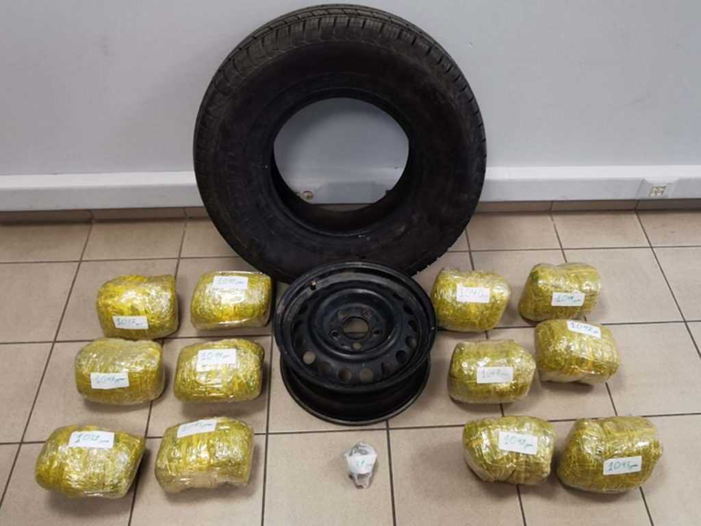 • 12 δέματα ακατέργαστης κάνναβης συνολικού βάρους 12 κιλών και 537 γραμμαρίων, τα οποία ήταν επιμελώς κρυμμένα εντός ελαστικού (ρεζέρβας),