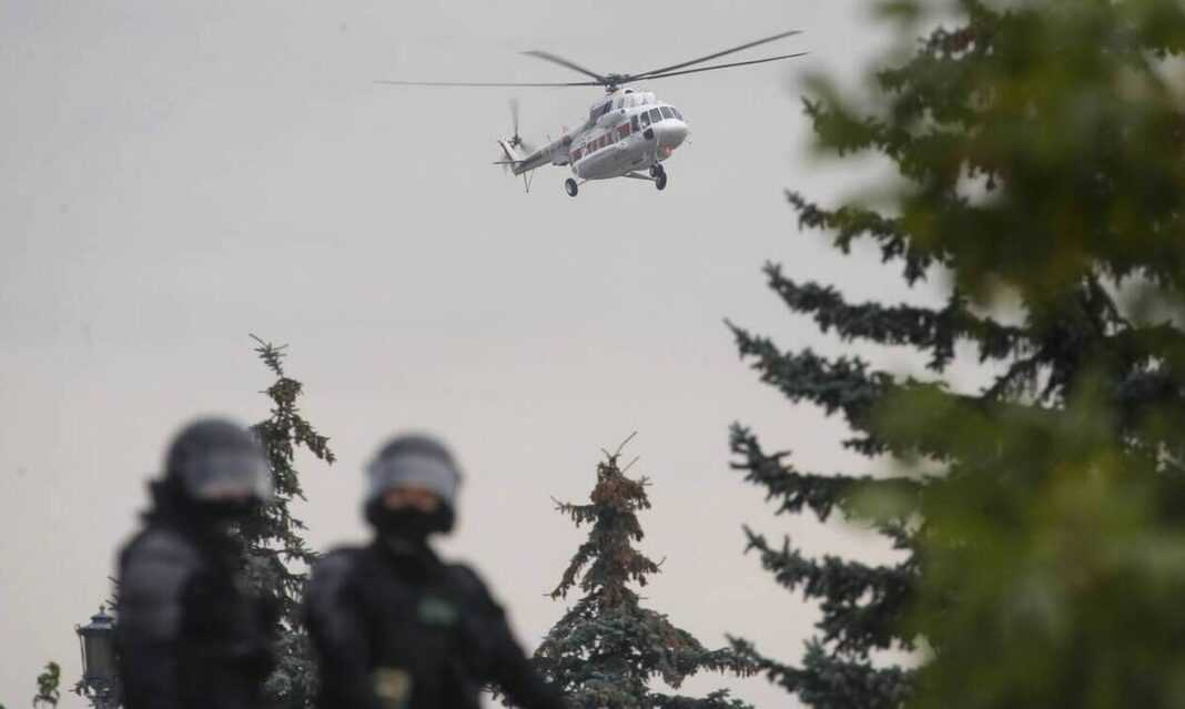 Ο Λουκασένκο πέταξε με το ελικόπτερο, μαζί με τον 15χρονο γιο του, τον Νικολάι, πάνω από τον χώρο όπου είχαν συγκεντρωθεί από το μεσημέρι οι αντιπολιτευόμενοι διαδηλωτές.