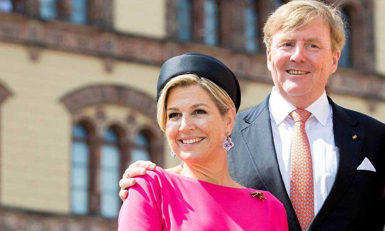 Η φωτογραφία δείχνει τον βασιλιά Βίλεμ-Αλεξάντερ να φορά πουκάμισο με σηκωμένα μανίκια και να κρατά τη μάσκα στο χέρι. Στο πλευρό του η σύζυγός του Μάξιμα, χαμογελαστή, και δίπλα της ένας άλλος άνδρας.