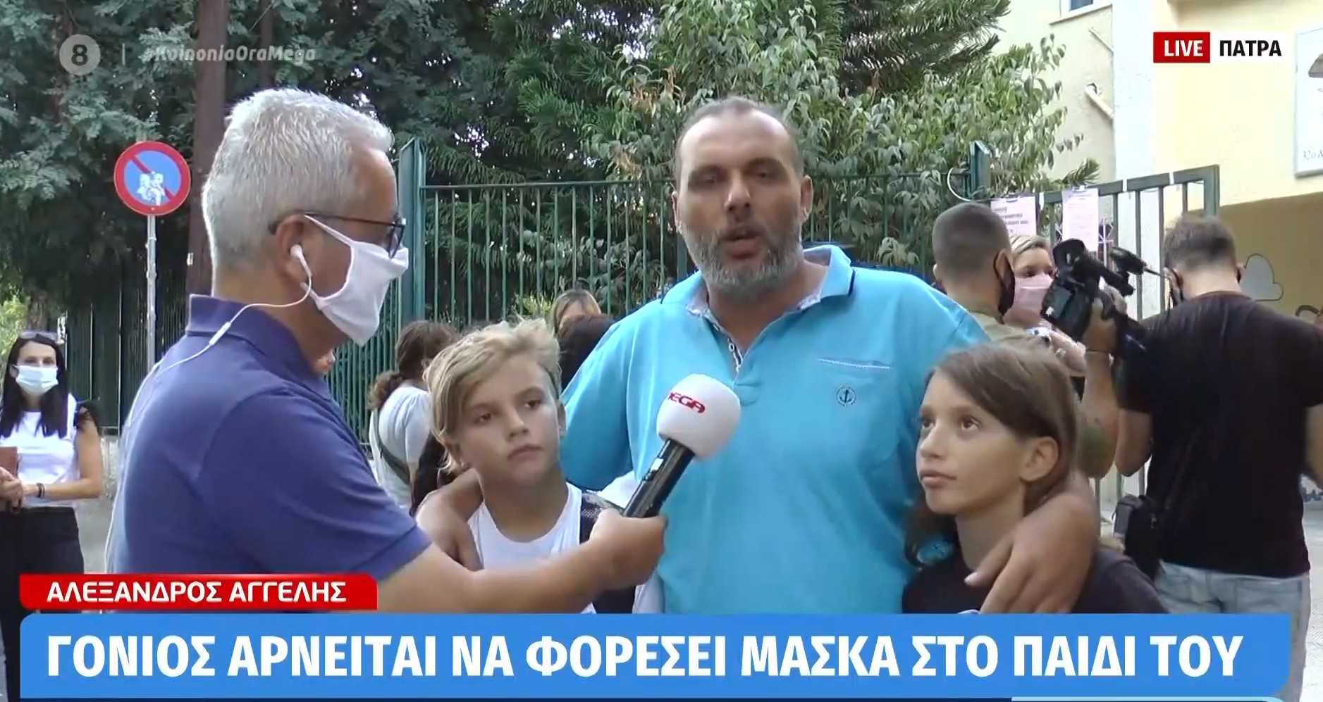 «Φυσικά και δεν θέλω να βάλουν τα παιδιά μου μάσκα. Μπορεί να προκαλέσει ακόμα και θανάτους η μάσκα, όπως έγινε στην Κίνα. Αποφάσισε η ανέτοιμη και ανέντιμη κυβέρνηση του κ. Μητσοτάκη να μην αφήσει τα παιδιά να αγιαστούν. Δικαίωμά του μέχρι να λήξει η θητεία του», είπε ο συγκεκριμένος γονιός στην κάμερα του MEGA.