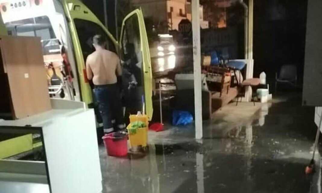 Ένα χαρακτηριστικό ότι μπήκε πολύ νερό στον τομέα του ΕΚΑΒ στις Μεσαμπελιές, όπου πλημμύρισαν γραφεία αλλά και οι χώροι ξεκούρασης των διασωστών.