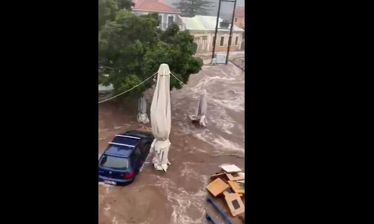 Εικόνες καταστροφής στο Φισκάρδο. Κατά τη διάρκεια της νεροποντής οι δρόμοι του οικισμού μετατράπηκαν σε χειμάρρους παρασύροντας στο διάβα τους ακόμα και αυτοκίνητα.
