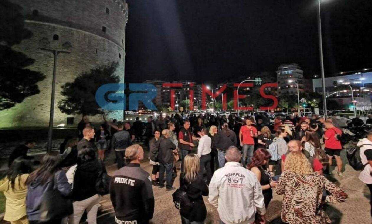 Οι καταστηματάρχες συγκεντρώθηκαν στο πλακόστρωτο του Λευκού Πύργου μετά το κλείσιμο των καταστημάτων τους τα μεσάνυχτα -τηρώντας τις αποστάσεις για την αποφυγή μετάδοσης του κορονοιου- για να διαμαρτυρηθούν για το περιορισμένο ωράριο λειτουργίας που έχει επιβληθεί σε νόμους της χώρας, λόγω της πανδημίας.