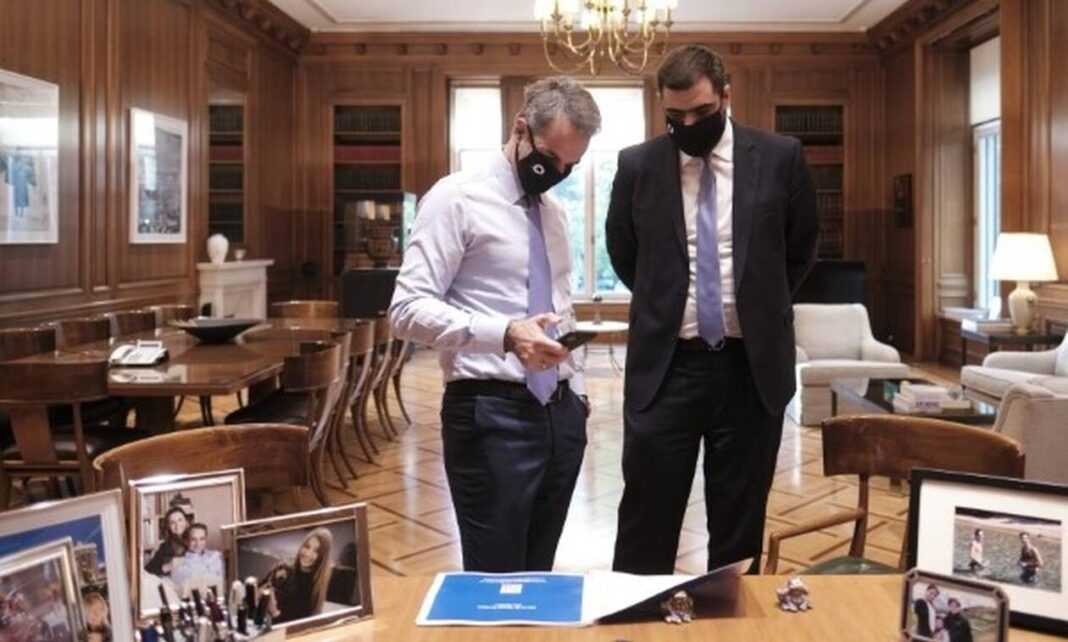Τον πρόεδρο της ΟΝΝΕΔ Παύλο Μαρινάκη υποδέχθηκε σήμερα στο Μέγαρο Μαξίμου ο πρωθυπουργός και πρόεδρος της Νέας Δημοκρατίας, Κυριάκος Μητσοτάκης.