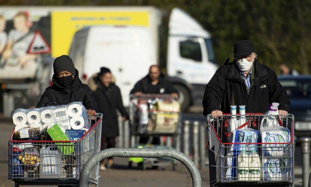 Κονσέρβες, ζυμαρικά, τρόφιμα μακράς διαρκείας και χαρτιά υγείας εξαφανίστηκαν σε λίγα λεπτά, ενώ οι εικόνες με τα γεμάτα καρότσια θύμισαν εκείνες του πρώτου lockdown στη Βρετανία.