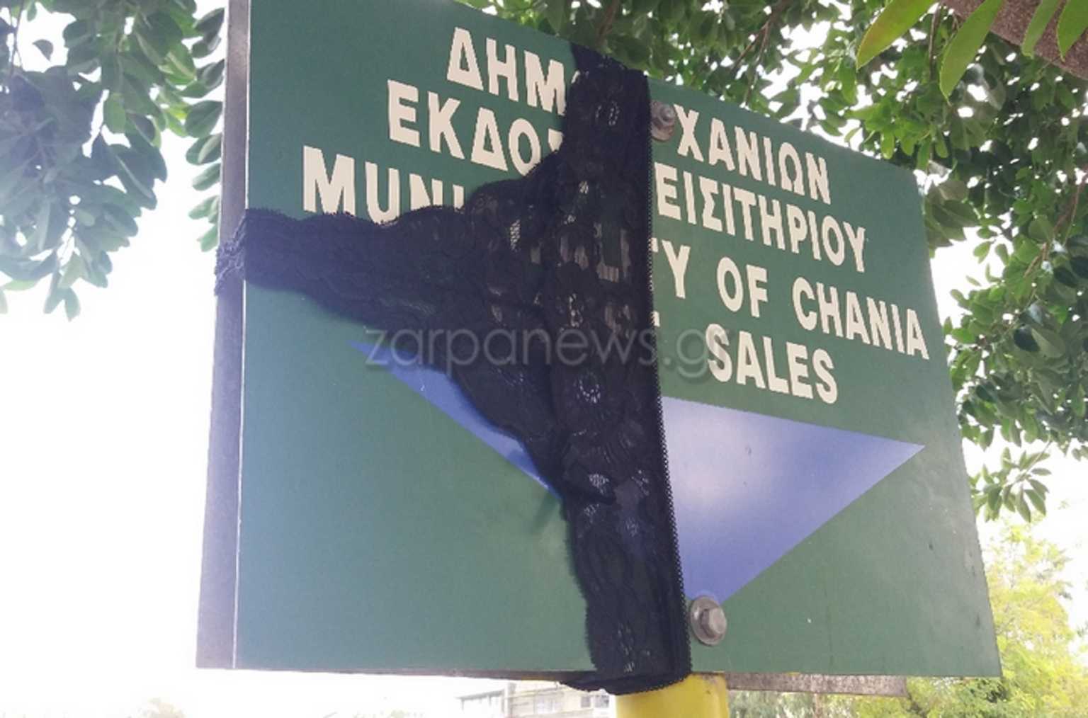 Μια… «σέξι» πινακίδα στην πλατεία Μαρκοπούλου στο κέντρο των Χανίων. Δεν ξέρουμε τι μπορεί να σκέφτονταν αυτός ή αυτή που τοποθέτησαν το γυναικείο εσώρουχο στην πινακίδα, όμως οι εικόνες που βλέπετε παρακάτω, κέντρισαν τα βλέμματα μικρών και μεγάλων.