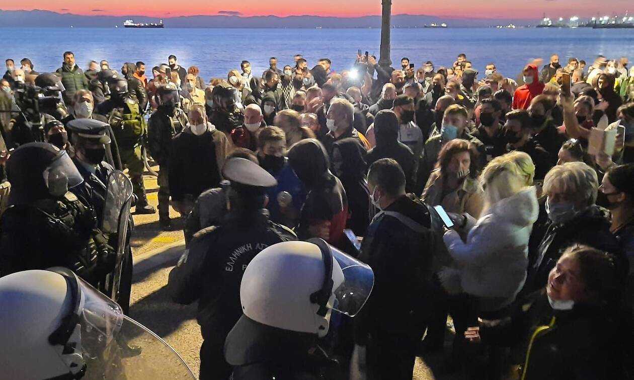 Τα άτομα συγκεντρώθηκαν κοντά στον Λευκό Πύργο, μέσω διαδικτυακού καλέσματος, προκειμένου να διαμαρτυρηθούν για την επιβολή lockdown.