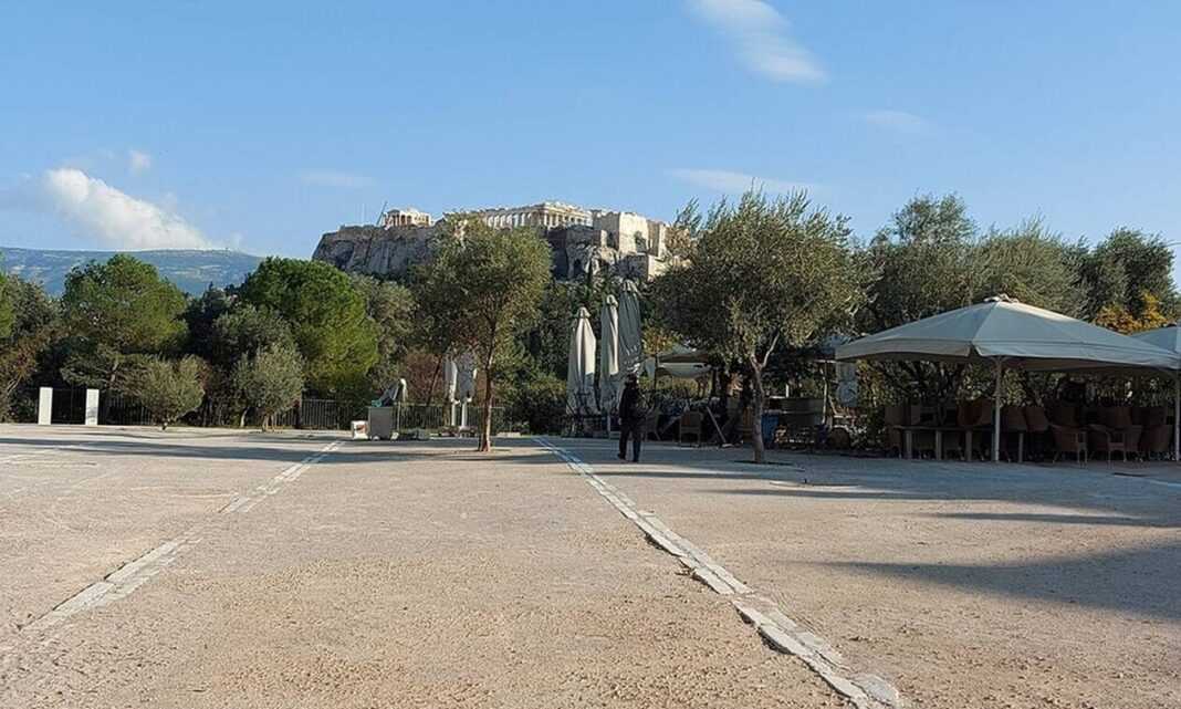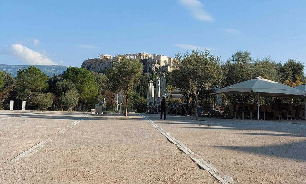 Συνεχίζω προς Πλάκα περνώντας από το Θησείο. Ένας μόνο μικροπωλητής στέκει εκεί από συνήθεια χωρίς πραμάτεια στον πάγκο του και με το ραδιοφωνάκι του να παίζει στη διαπασών. Το μόνο που καταφέρνω να ξεχωρίσω μέσα στην απρόσμενη βαβούρα είναι κάτι για το άλλο θέμα των ημερών, τις εκλογές των ΗΠΑ. Η έτσι κι αλλιώς σχετικά ήσυχη Διονυσίου Αρεοπαγίτου ερημώνει κυριολεκτικά αφού είναι κλειστό και το μουσείο της Ακρόπολης. Σιγοτραγουδάω τους στίχους «κάποιος κοιτάει την ώρα, κάποιος στο δρόμο τρέχει…κι όμως είμαι ακόμα εδώ…» από τα Ξύλινα Σπαθιά που για κάποιο λόγο μου έρχονται στο μυαλό.