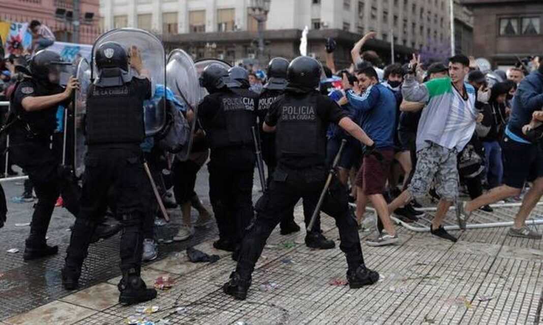 Εικόνες χάους στην πρωτεύουσα της Αργεντινής. Οι δρόμοι του Μπουένος Άιρες γύρω από την Casa Rosada, το Προεδρικό Μέγαρο της χώρας όπου η σορός του Ντιέγκο Μαραντόνα είχε τεθεί σε λαϊκό προσκύνημα, μετατράπηκαν σε πεδίο μάχης καθώς ο όγκος του πλήθους ήταν τέτοιος που η αστυνομία δεν μπόρεσε να ελέγξει την κατάσταση.