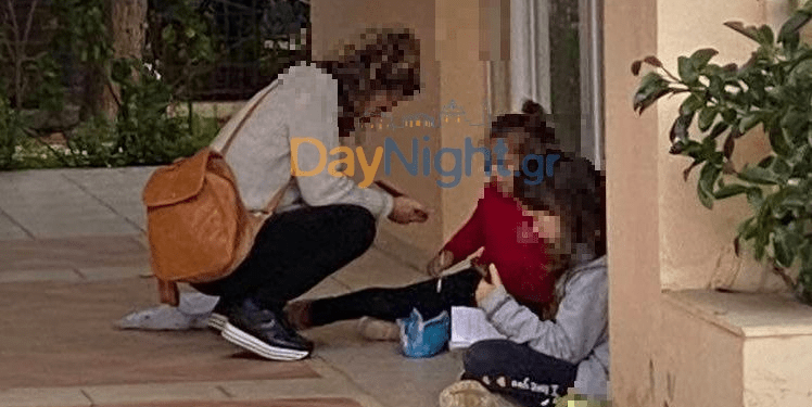 Την ίδια στιγμή, σε μια πυλωτή σπιτιού στην περιοχή Περιβόλια Ρεθύμνου, μία μητέρα κάθεται υπομονετικά μπροστά από τις δύο κόρες της και κρατώντας στο ένα της χέρι το κινητό της τηλέφωνο, προσπαθεί να βοηθήσει την μικρότερη ώστε να παρακολουθήσει το μάθημά της. Την ίδια στιγμή, με ένα δεύτερο κινητό και μπροστά της απλωμένα βιβλία, τετράδια και μολύβια, η μεγαλύτερη κόρη παρακολουθεί κι εκείνη τη δασκάλα της.