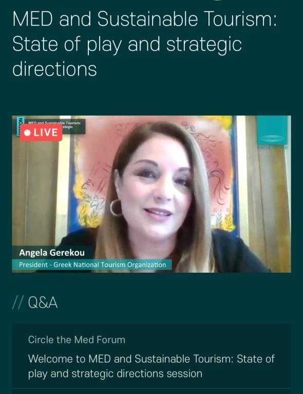 Στην ομιλία της στη διαδικτυακή συνάντηση με θέμα: «Μεσόγειος και Βιώσιμος Τουρισμός: Η σημερινή κατάσταση και οι στρατηγικές κατευθύνσεις», η κα Γκερέκου διαβεβαίωσε ότι «ο ΕΟΤ στηρίζει όλες αυτές τις προσπάθειες, καθώς η βιώσιμη ανάπτυξη θα είναι βασική μας προτεραιότητα και στις καμπάνιες προβολής της χώρας μας».