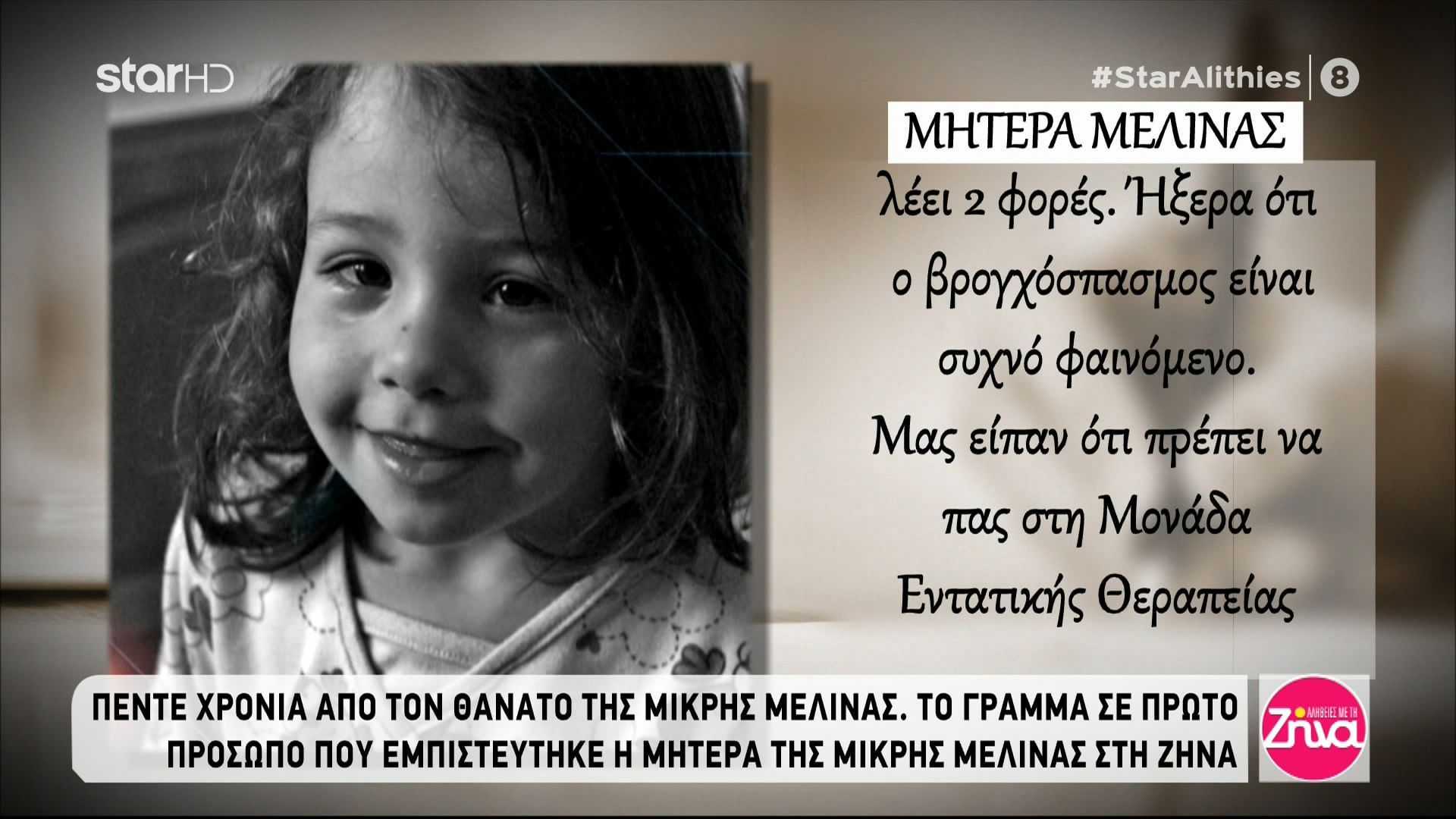 Πέντε χρόνια από τον θάνατο της μικρής Μελίνας, σε μια επέμβαση ρουτίνας για κρεατάκια, η μητέρα της εμπιστεύτηκε την εκπομπή “Αλήθειες με τη Ζήνα” για να μοιραστεί τις αλήθειες της, μέσα από ένα γράμμα που έγραψε σε πρώτο πρόσωπο προς τη μικρή Μελίνα της.