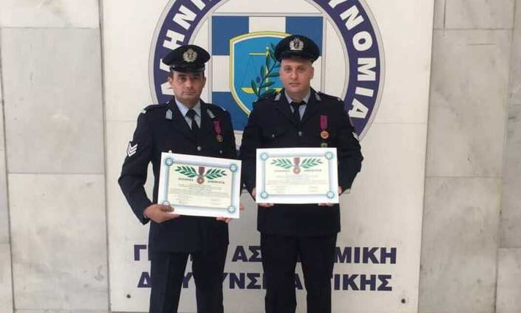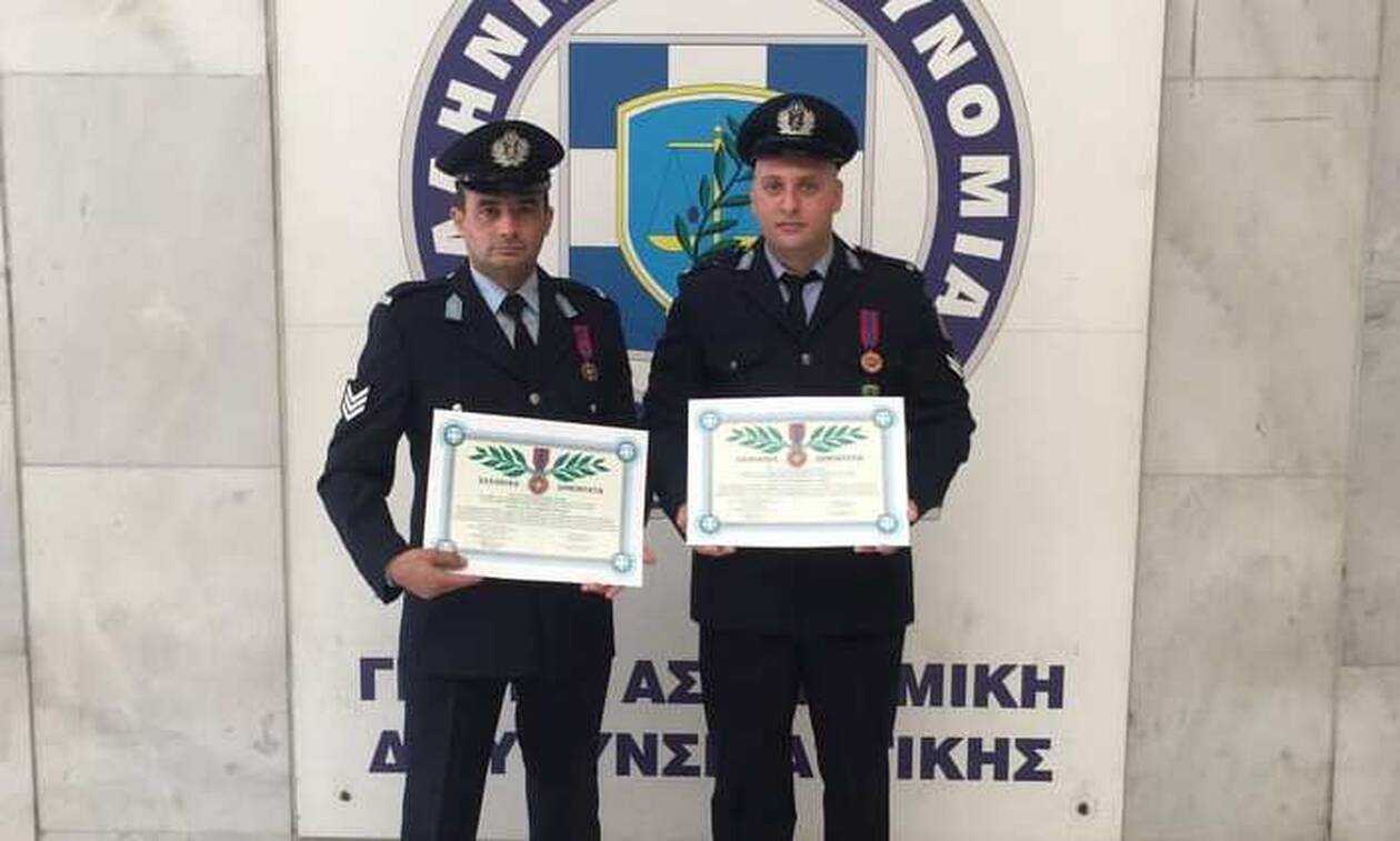 Πρόκειται για τους αστυνομικούς Αργύρη Μούρτικα και Σπύρο Σταμουκώστα, οι οποίοι πήραν την τιμητική πλακέτα με το σήμα του «Αστυνομικού Σταυρού» που αποτελεί μετάλλιο αυταπάρνησης.