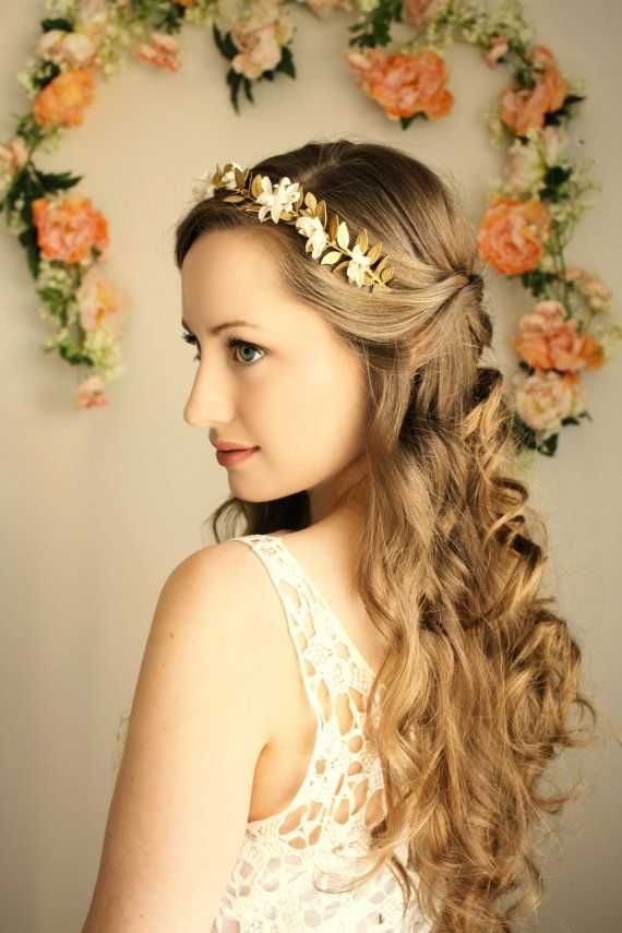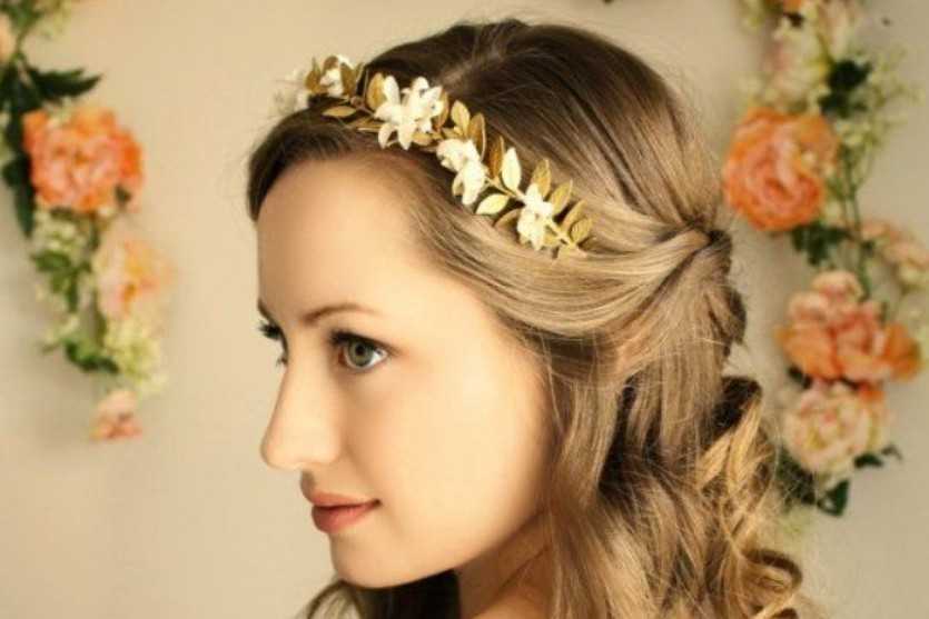 Αν έχεις μακριά και πλούσια μαλλιά, κάνε έντονες μπούκλες και πιάσε τις δύο μπροστινές τούφες προς τα πίσω ώστε να είναι σαν πιασμένα μισά μισά. Τη διαφορά θα κάνει το χρυσό headband που μοιάζει με μικρό αρχαιοελληνικό στεφάνι.