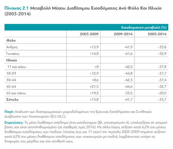 Εκεί φαίνεται ότι οι νέοι ήταν οι μεγάλοι χαμένοι της κρίσης, ενώ μικρότερο μέρος του εισοδήματός τους έχασαν οι πολίτες ηλικίας 45-64 και ακόμη μικρότερο, το μικρότερο όλων, οι ηλικιωμένοι άνω των 65 ετών. Όσον αφορά τη σύνθεση κάθε νοικοκυριού, οι απώλειες ήταν μεγαλύτερες για τις οικογένειες με ένα ή δύο παιδιά παρά για εκείνες χωρίς παιδιά, ή με τρία παιδιά και άνω.