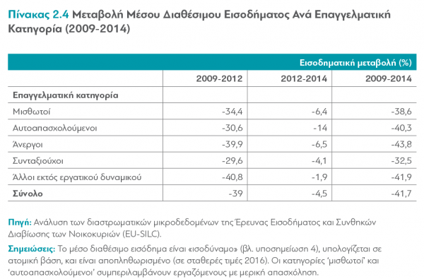 Συγκεκριμένα, την περίοδο 2003-2009, δηλαδή πριν από το ξέσπασμα της κρίσης, το μέσο ισοδύναμο διαθέσιμο εισόδημα των ελληνικών νοικοκυριών αυξήθηκε κατά 14%. Όμως με την εκδήλωση της κρίσης, δηλαδή την περίοδο 2009-2014, το ισοδύναμο εισόδημα μειώθηκε πολύ περισσότερο από όσο αυξήθηκε προηγουμένως, κατά 42%, όπως αποκαλύπτει η έρευνα της διαΝΕΟσις.