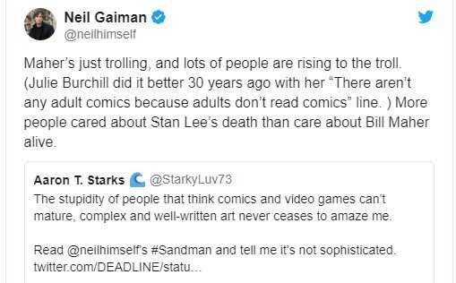 O συγγραφέας Νιλ Γκέιμαν ήταν σαφής, ανάμεσα σε όσους απάντησαν στον Μπιλ Μάχερ, υπενθυμίζοντάς του επίσης τη «συμμετοχή» του στο «Iron Man 3»:
