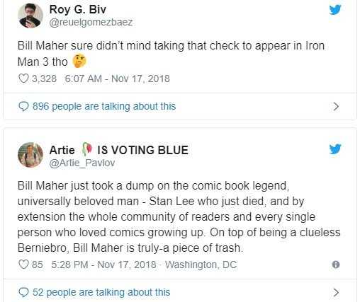 Σε μια μάλλον σοκαριστική δήλωση άγνοιας ή, καλύτερα, αμάθειας στο προσωπικό του site, ο Μπιλ Μάχερ θέλησε να ειρωνευτεί όσους έσπευσαν να αποχαιρετήσουν στον Σταν Λι, τον πατέρα των σύγχρονων κόμικς, τη θρυλική φιγούρα της Marvel και της κληρονομίας της, ο οποίος πέθανε σε ηλικία 95 ετών τη Δευτέρα 12 Νοεμβρίου.